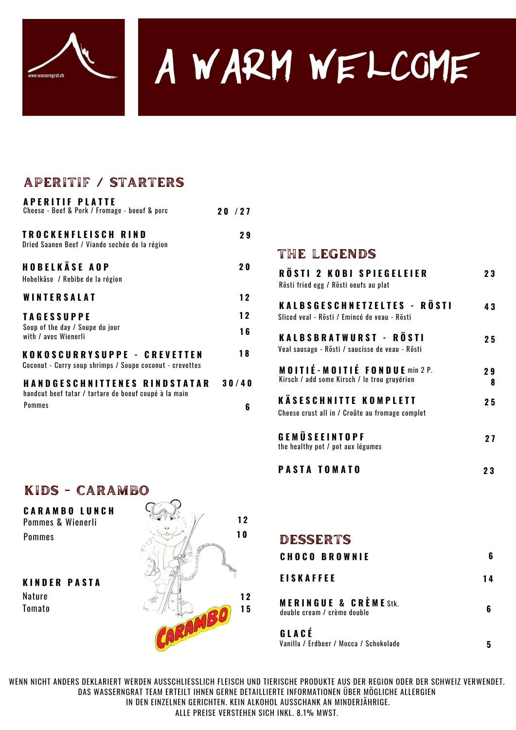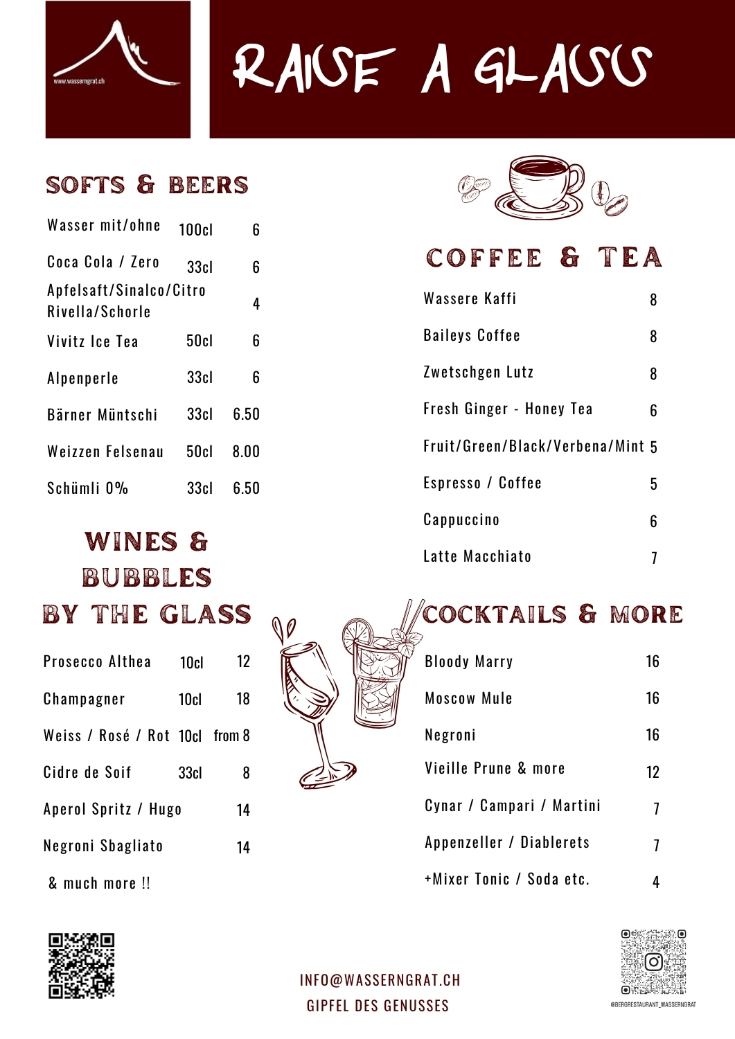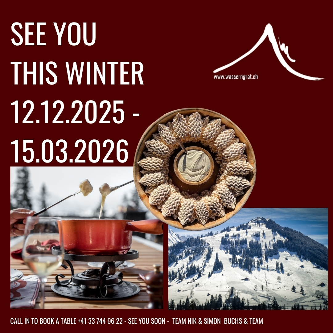 Erstklassige und regionale Produkte werden mit viel Liebe, Passion und Kreativität zubereitet und mit auserwählten Weinen serviert. Egal ob für Firmenanlässe, Sitzungen und Seminare auf der Sonnenterrasse oder im Stübli, Hochzeitszeremonien und Feste, Geburtstage oder “Feste ohne Grund“, der Wasserngrat ist die einzigartige Location inmitten einer atemberaubenden Bergwelt.